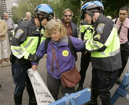 Immediately, Kirschenbaum turned to some nearby Boston policemen and screamed "Charge her! Charge her!" Without even asking questions, two policemen lunged at Diane, handcuffed her, and brought her to a nearby police station. (Why did this petite woman require being handcuffed? A good question.)
