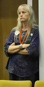 Lining up to testify . Lesbian lobbyist Arline Isaacson (left) did a masterful job of bringing in various characters to testify. Here, a new batch is waiting their turn as the day wears on. |