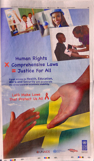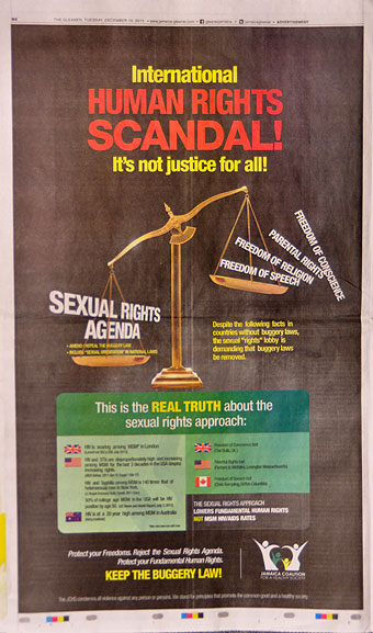 This slick full-page ad by the homosexual movement appeared in Jamaican newspapers, meant to soften the public on the "human rights" and "justice" aspects of repealing the Buggery Law. Note the logos for United Nations-affiliated groups on the bottom, which appear to be funding this campaign. |
