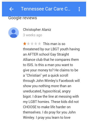 See for yourself: Vicious, brownshirt tactics by LGBT activists against local Christians who criticize the "gay club" in their high school.The true face of the crowd that publicly talks about "love" and "tolerance" -- full of hate and bigotry.CAUTION: Obscene materialPOSTED: March 12, 2016The LGBT movement has begun a vicious, obscene social media campaign against local townspeople in Franklin County, Tennesses, because they have objected to the "gay" GSA club recently put into the high school. Below is an example of one family that being victimized. John Wimley, a local parent, spoke out against the GSA club.. They are attacking him and his school-age daughter, and trying to get his local car-repair shop closed down. Posts attacking Mr. Wimley and his daughter: