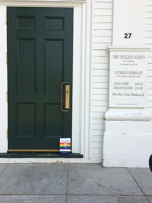 Sally Naumann, an 85-year-old resident of Carlisle and a longtime MassResistance activist, had had enough. She was very upset that the Unitarian Church in the center of town is flying a “gay” rainbow flag outside. She is distressed because people she knows have died of “gay”-related diseases. She strongly believes the homosexual lifestyle should not be promoted.