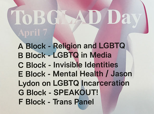 What you're up against. This is the actual schedule of an all-day "Transgender Bisexual Gay and Lesbian Awareness Day" event held this past April at a high school. Classwork postponed so teachers can bring their classes to each program.
