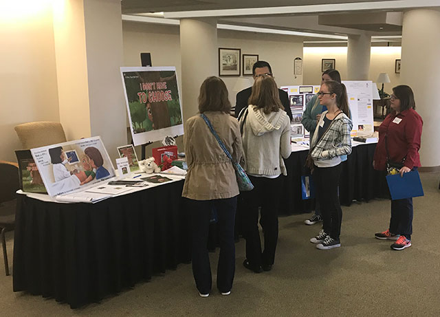 Teens and parents at a booth with material exposing the propaganda being pushed at kids.