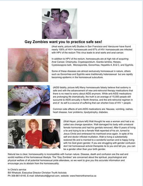 Bill Whatcott and his brave group of six elite top secret Christian commandos (disguised as "gay" zombies) handed out 3,000 of these little packages on the Toronto homosexual pride parade route in 2016 sparking a $104 million lawsuit, a Canada wide arrest warrant for an indictable hate crimes charge, and touched thousands of lives straight and perverted with the truth that points to Jesus Christ as the answer.